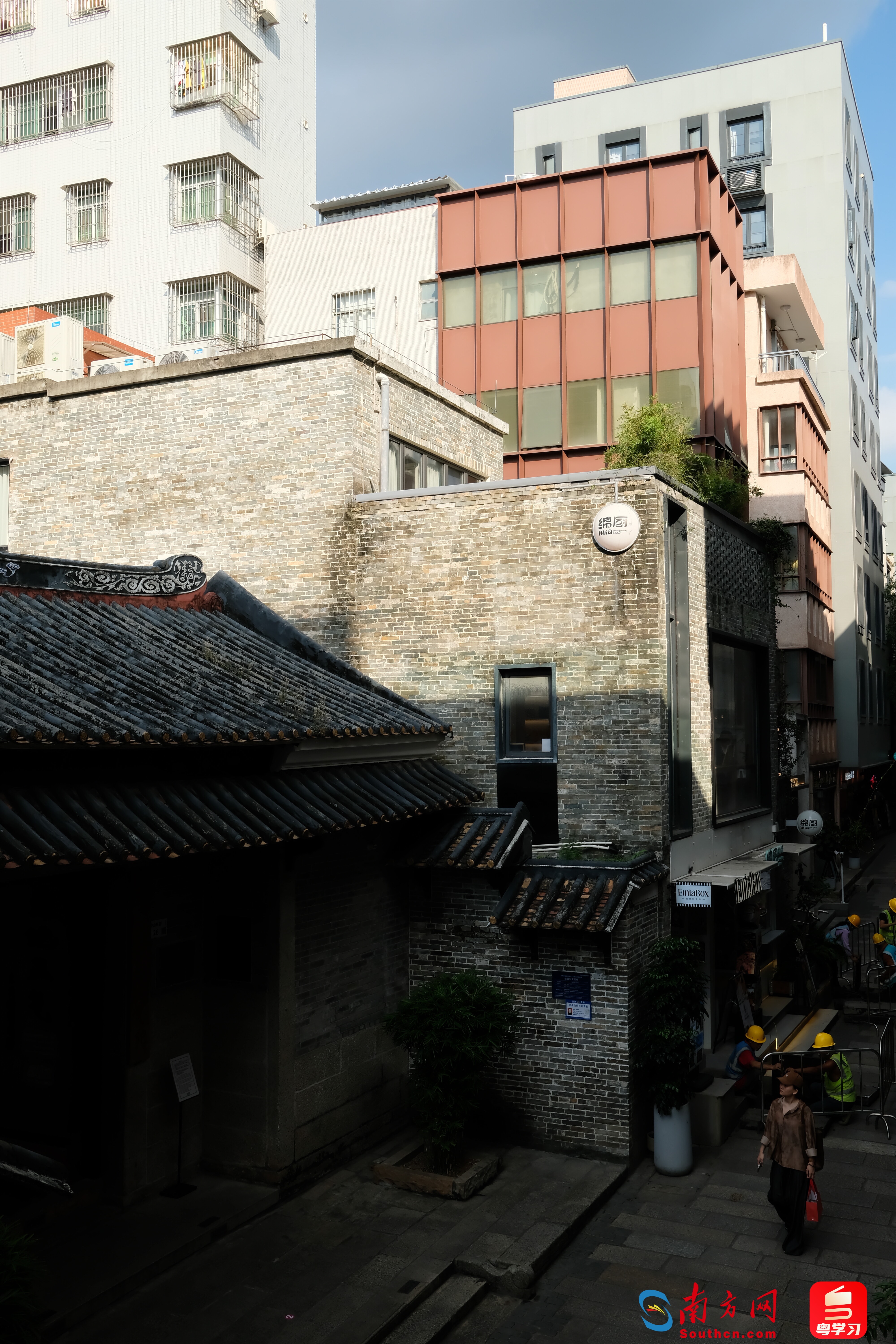 在厘米制造阳台上往下看,便是信国公文氏祠堂,周边原来的城中村建筑进行了改造。(摄影:夏偲婉)