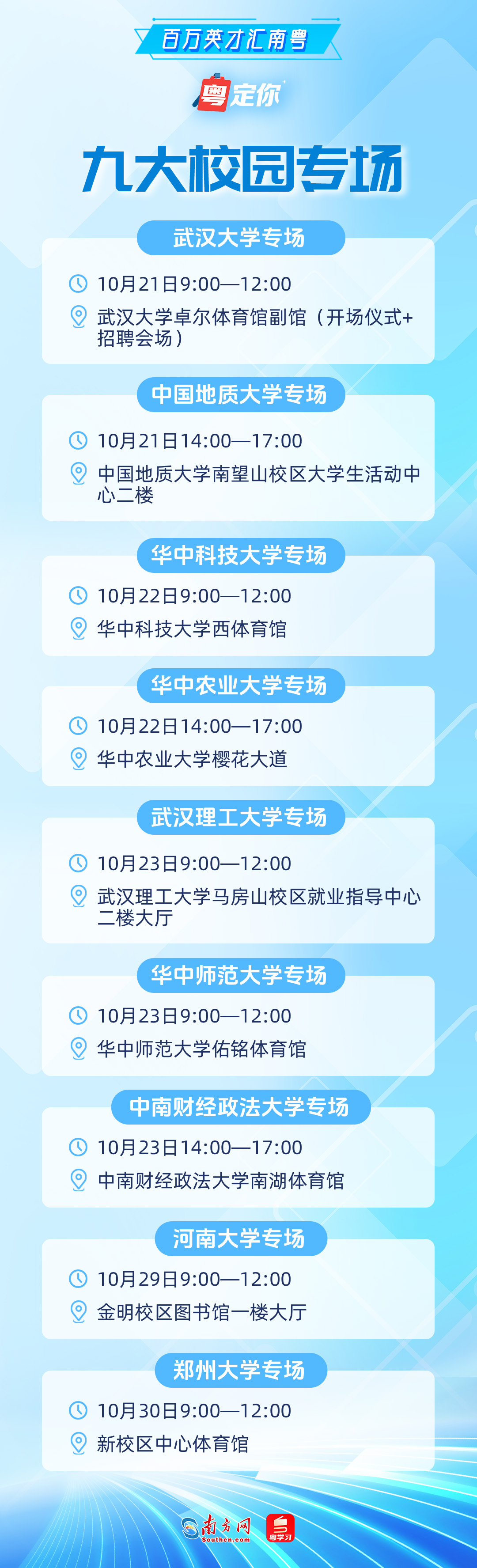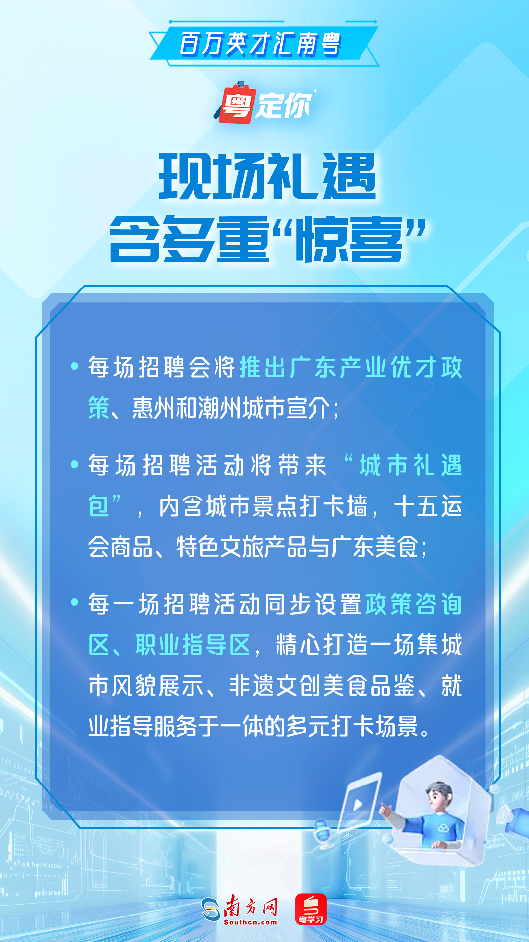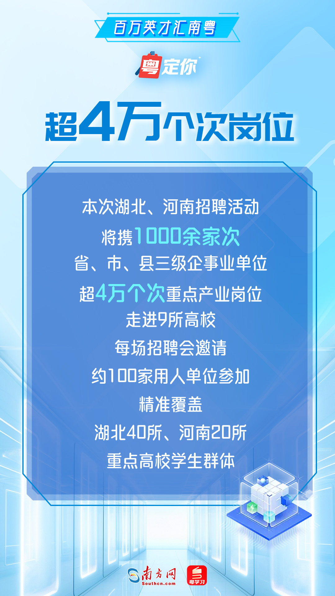 10月21日至30日,“百万英才汇南粤”2025年N城联动第二批秋季招聘活动将走进湖北、河南等地高校,本次招聘携超4万个次重点产业岗位、极具竞争力的薪酬待遇与全链条保障政策,向全国优秀学子发出“逐梦南粤热土、志绘惠州、潮州宏图”的诚挚邀约。活动还有哪些亮点?一组海报速览↓↓↓