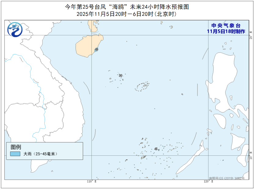 降水预报:5日20时至6日20时,海南岛东南部的部分地区、西沙群岛、南沙群岛等地将有大雨(25—45毫米)。