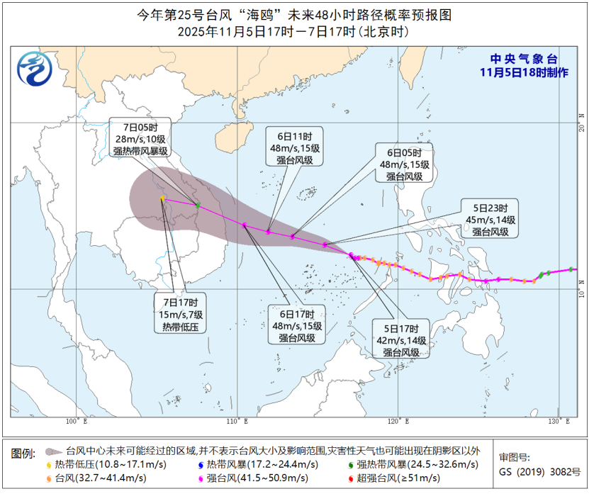 11月5日18时,中央气象台继续发布台风黄色预警。今年第25号台风“海鸥”已于今天(5日)下午加强为强台风级,今天下午5时其中心位于越南嘉莱省归仁市东偏南方向约860公里的南海东南部海面,就是北纬12.1度、东经117.0度,中心附近最大风力有14级(42米/秒),中心最低气压为955百帕,七级风圈半径250—330公里,十级风圈半径120—150公里,十二级风圈半径70公里。