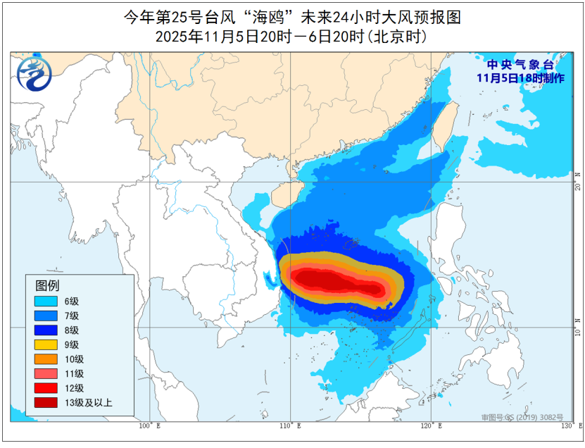 大风预报:5日20时至6日20时,受“海鸥”和南下冷空气的共同影响,台湾海峡、台湾以东洋面、巴士海峡、南海大部及黄岩岛、东沙群岛、中沙群岛、西沙群岛、南沙群岛南部将有6—8级大风、阵风9—10级,其中南海中部和南部的部分海域、南沙群岛北部将有9—11级大风、阵风12—13级,“海鸥”中心经过的附近海域风力有12—15级、阵风16—17级。