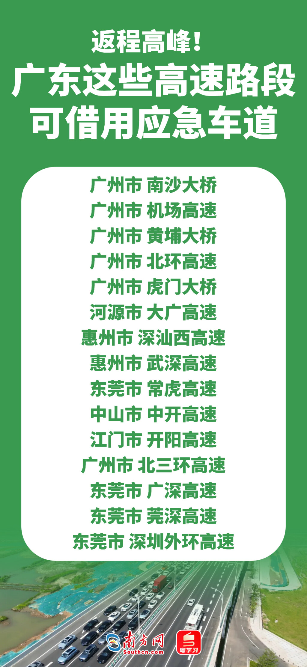 截至10月8日中午,广东有16个易堵路段已按需实施借道措施,允许小客车借用应急车道(硬路肩)通行。交通部门提醒,为确保行车安全,开放借用应急车道(硬路肩)通行的路段现场设置了标志牌、情报板、喇叭或指示灯等引导车流通行,请广大司机朋友按指示行驶。