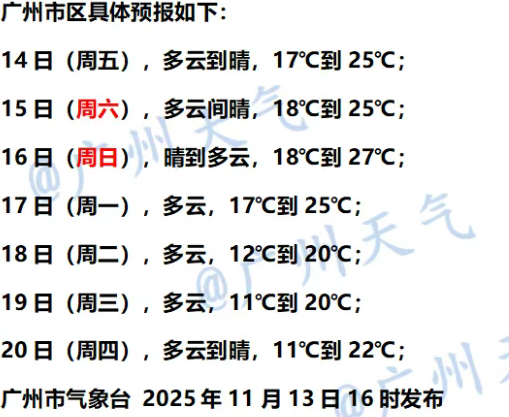此外,据@广州天气 预计,到了下周一(17日),一股强冷空气将自北向南影响广东,带来大风降温天气。以广州为例,下周最高气温将跌破20℃,最低气温逼近10℃,注意及时添衣保暖。