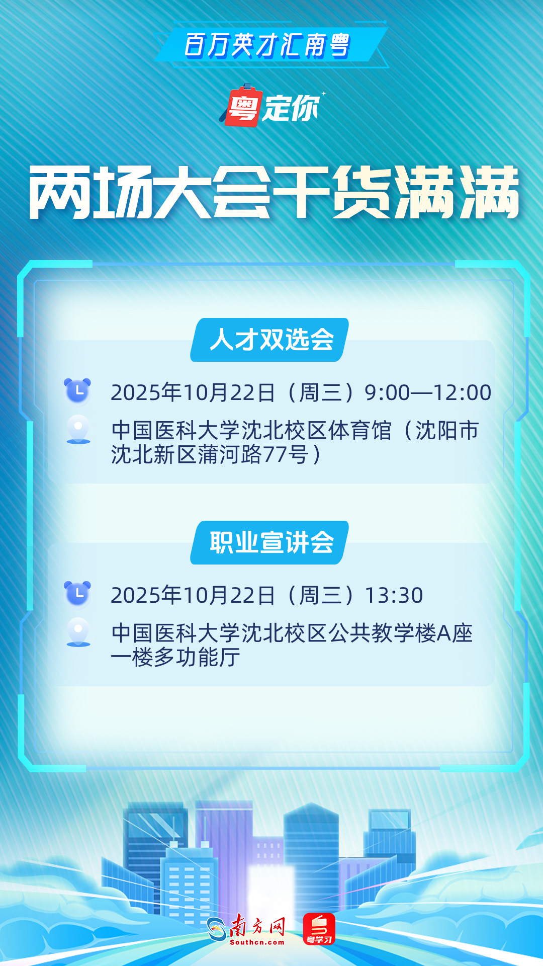 10月22日,“百万英才汇南粤”2025年医疗卫生专项招聘活动(辽宁站)将在沈阳举行,62家医疗卫生单位在中国医科大学开启一场诚意满满的“人才双选会”。活动亮点如何?一组海报速览。