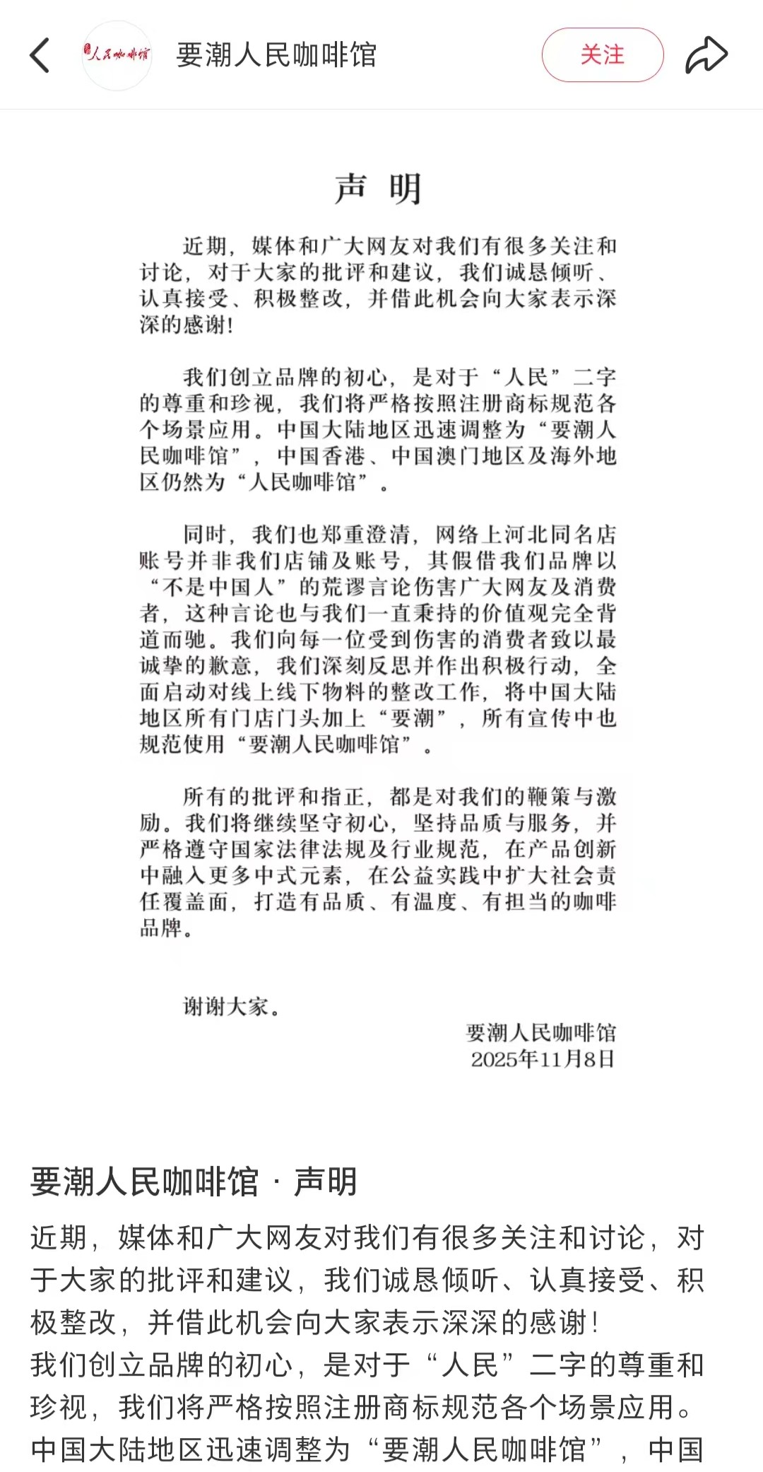 11月8日上午,要潮人民咖啡馆发布声明致歉,并表示全面启动对线上线下物料的整改工作,将中国大陆地区所有门店门头加上“要潮”,所有宣传中也规范使用“要潮人民咖啡馆”。