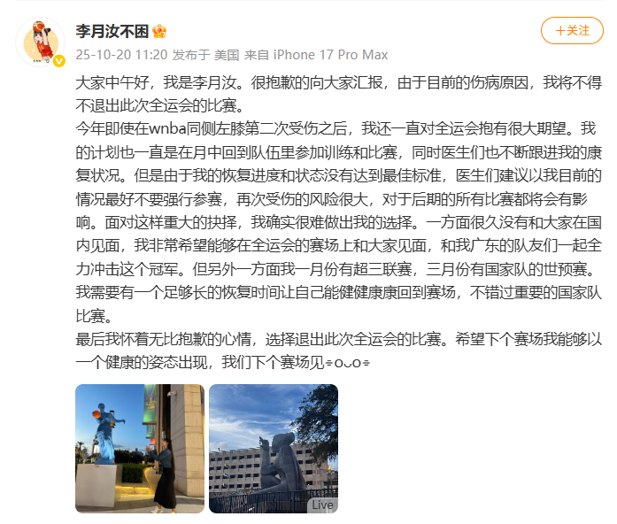 10月20日,已入选十五运会广东省女篮名单的国手李月汝在微博发文,宣布自己将因伤退出本届全运会比赛。