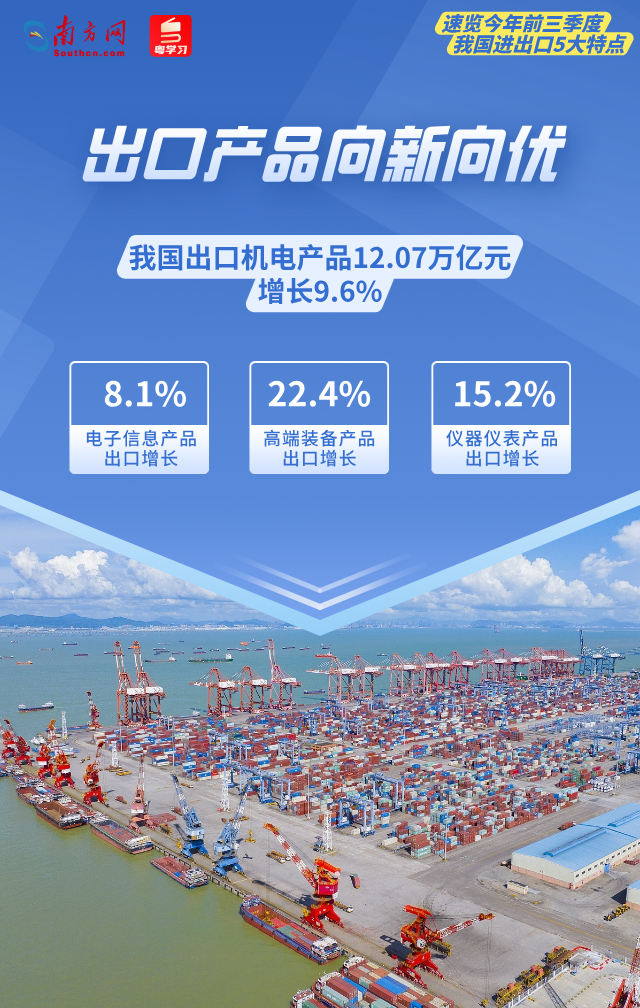 三是出口产品向新向优。前三季度,我国出口机电产品12.07万亿元,增长9.6%,占出口总值的60.5%,提升了1.4个百分点。其中,出口电子信息、高端装备、仪器仪表等高技术产品分别增长8.1%、22.4%和15.2%;“新三样”产品、铁道电力机车等绿色产品增速均达到两位数。