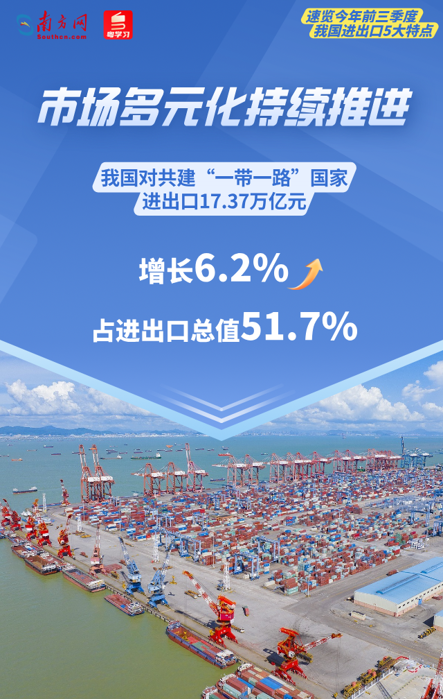 二是市场多元化持续推进。前三季度,我国对共建“一带一路”国家进出口17.37万亿元,增长6.2%,占进出口总值的51.7%,比重提升了1.1个百分点。对东盟、拉美、非洲、中亚等进出口分别增长9.6%、3.9%、19.5%和16.7%。对亚太经合组织(APEC)其他经济体进出口增长2%。