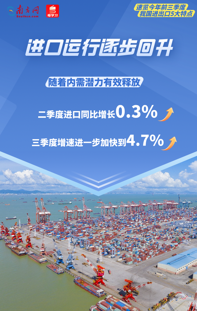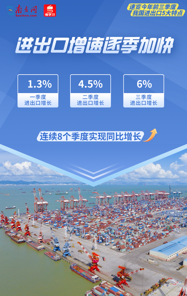 一是进出口增速逐季加快。今年一、二季度我国进出口分别增长1.3%和4.5%,三季度增长6%,已连续8个季度实现同比增长。