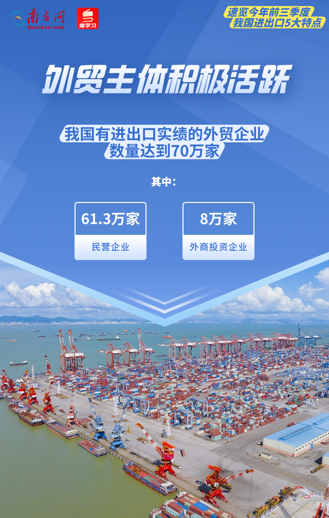五是外贸主体积极活跃。前三季度,我国有进出口实绩的外贸企业数量达到70万家,同比增加了5.2万家。其中,民营企业61.3万家,进出口19.16万亿元,增长7.8%;外商投资企业8万家,进出口9.82万亿元,增长3.1%。