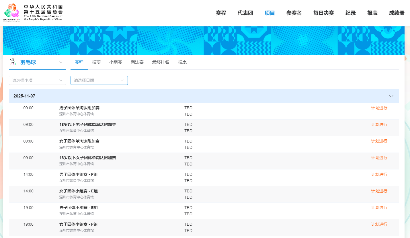 根据十五运会官网显示,羽毛球项目比赛将于11月7日在深圳市体育中心体育馆开赛。