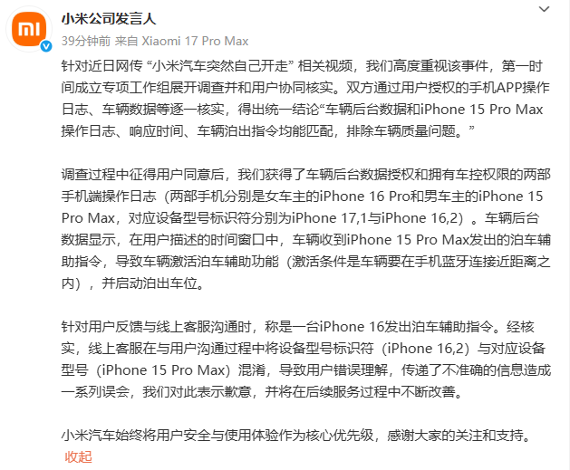 针对近日网传 “小米汽车突然自己开走” 相关视频,我们高度重视该事件,第一时间成立专项工作组展开调查并和用户协同核实。双方通过用户授权的手机APP操作日志、车辆数据等逐一核实,得出统一结论“车辆后台数据和iPhone 15 Pro Max操作日志、响应时间、车辆泊出指令均能匹配,排除车辆质量问题。”
