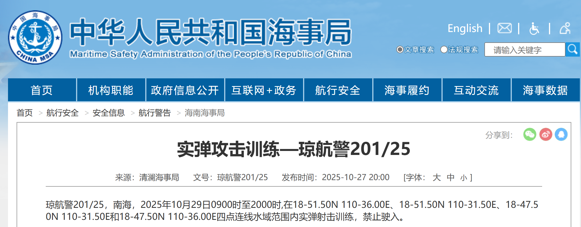 记者从中国海事局获悉,10月29日9时至20时,南海局部海域将进行实弹射击训练,提醒无关船只禁止驶入。