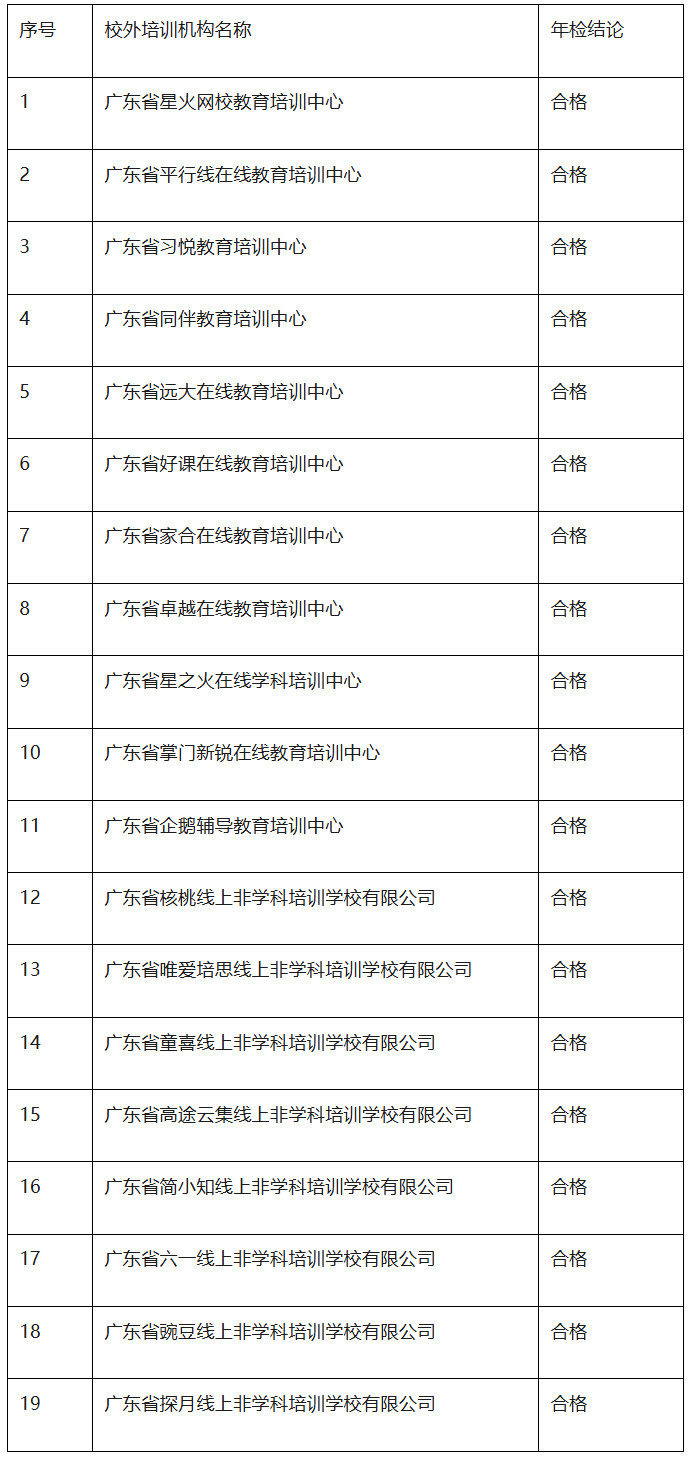备注:我省现审批校外线上培训机构一共22家。除上述19家机构之外,另外3家(广东省火花线上非学科培训学校有限公司、广东省猿力线上非学科培训学校有限公司、广东省鹿溪线上非学科培训学校有限公司)非学科类校外线上培训机构截至2024年12月31日不满1年,本次不出具年检结论。