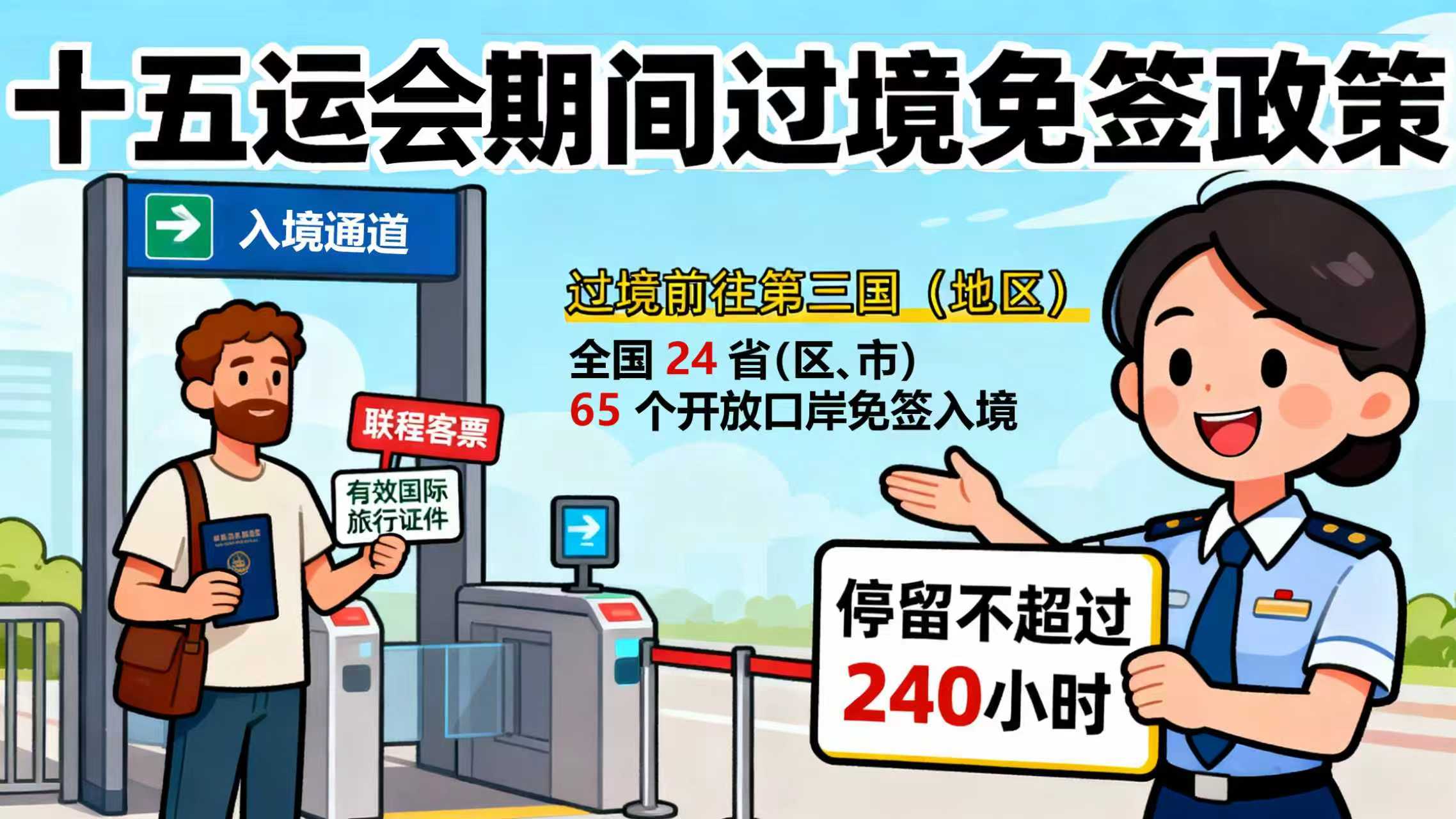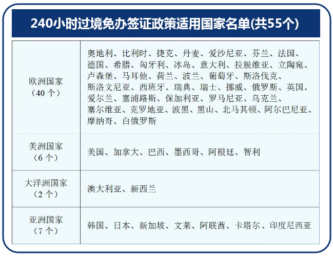 适用政策的55国公民持有效国际旅行证件和联程客票,从中国过境前往第三国(地区)时,可从全国24省(区、市)65个开放口岸免签入境,在规定区域停留不超过240小时。停留期间可从事观赛、旅游、商务等活动,工作、学习等需事先批准的活动除外。