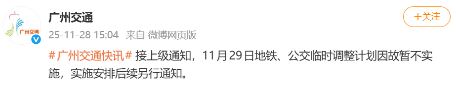 11月28日,广州市交通运输局官方微博@广州交通 发布消息,11月29日地铁、公交临时调整计划因故暂不实施,实施安排后续另行通知。