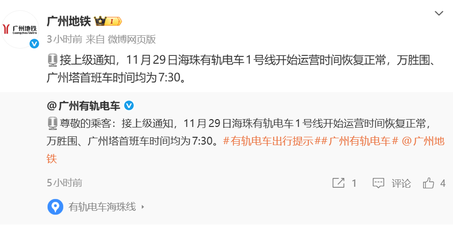 此外,@广州地铁 发文称,11月29日海珠有轨电车1号线开始运营时间恢复正常,万胜围、广州塔首班车时间均为7:30。