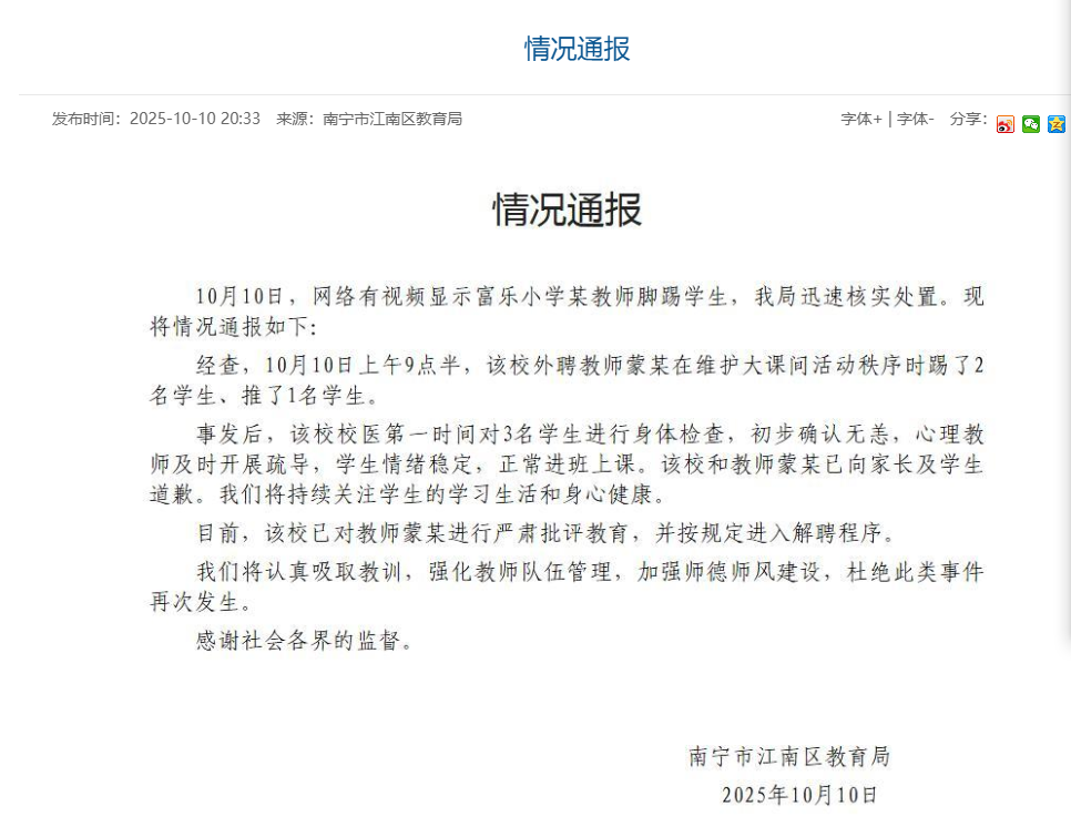 10月10日晚,广西南宁市江南区教育局发布情况通报: