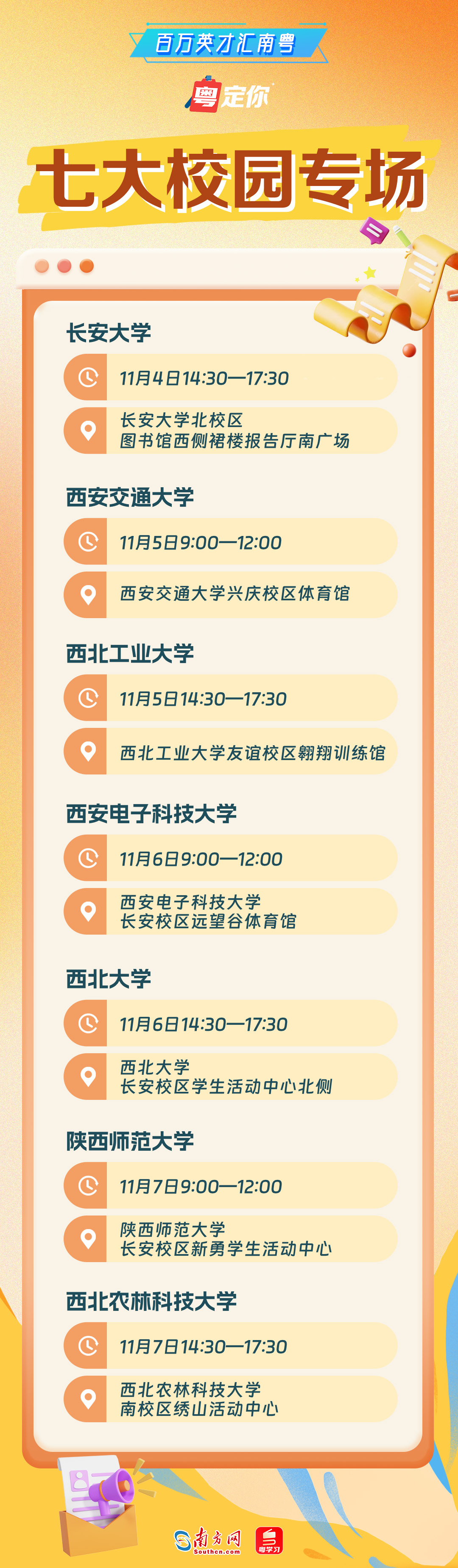 11月4日—7日,“百万英才汇南粤”2025年N城联动秋季陕西地区重点高校招聘活动将在西安交通大学、西北工业大学、西北农林科技大学、西安电子科技大学、陕西师范大学、西北大学、长安大学七所重点高校开展。腾讯、格力、中创新航、联通、中国人寿等名企集结,3.3万多个岗位即将落地,还有众多实习岗位助力职业启航,HR在线等你投递简历。