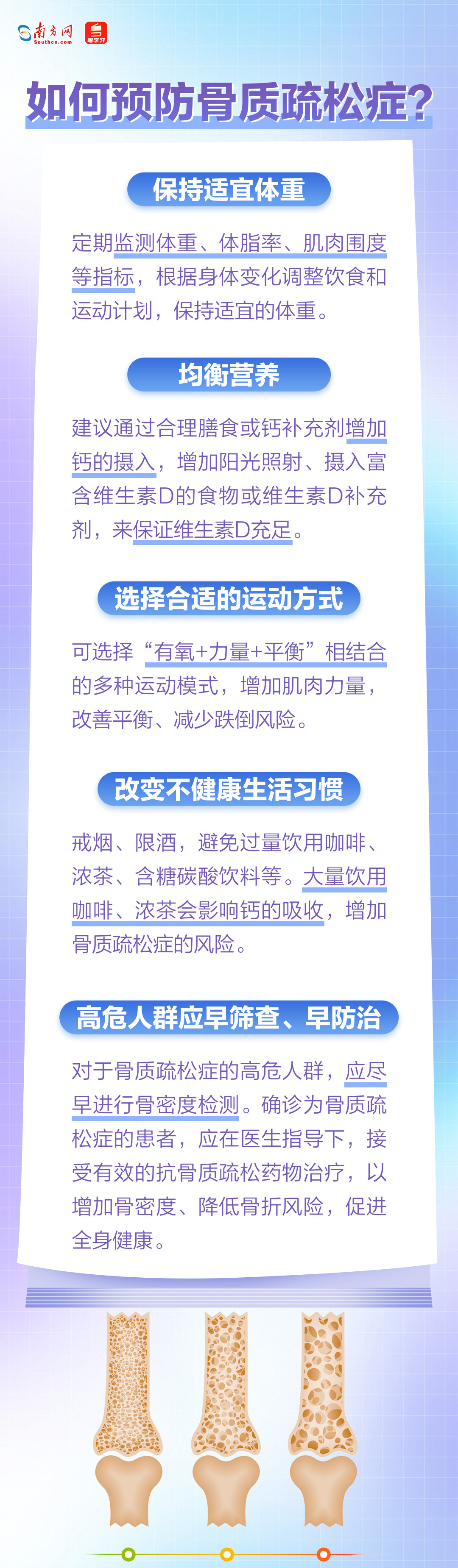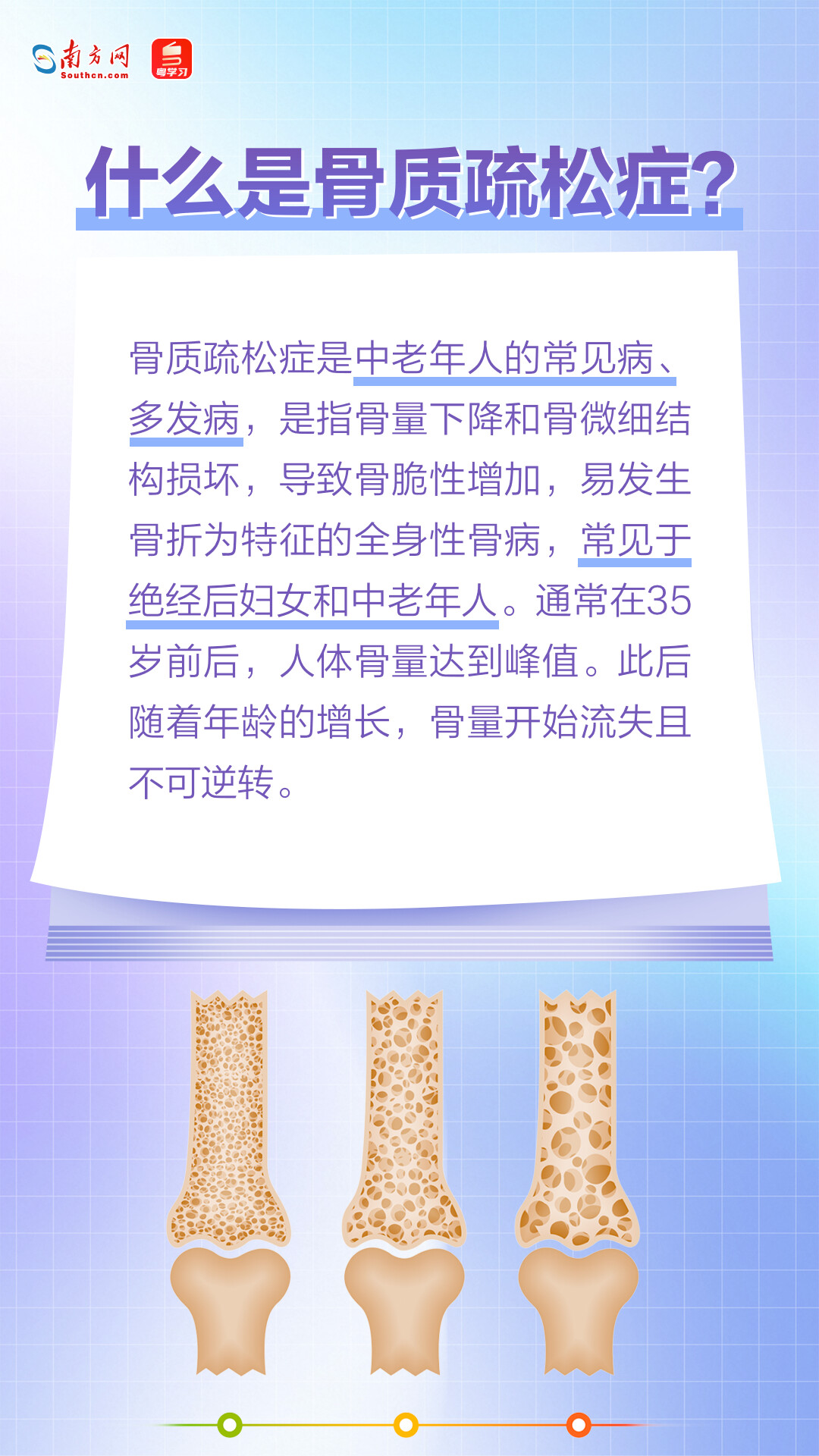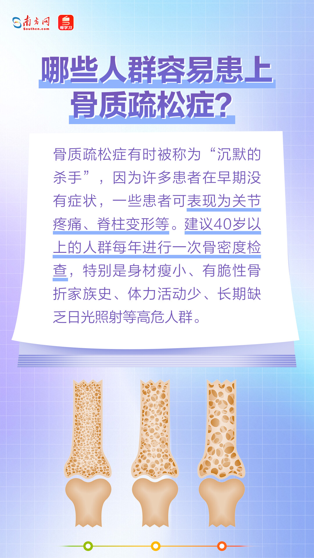 每年10月20日是世界骨质疏松日。骨质疏松症是一种“静悄悄的流行病”,以骨量减少、骨微结构破坏为特征,导致骨强度下降,骨折风险显著升高。目前我国骨质疏松症患病人数约9000万,其中女性约7000万。哪些人群容易患上骨质疏松症?又应如何预防、应对?一起来看。