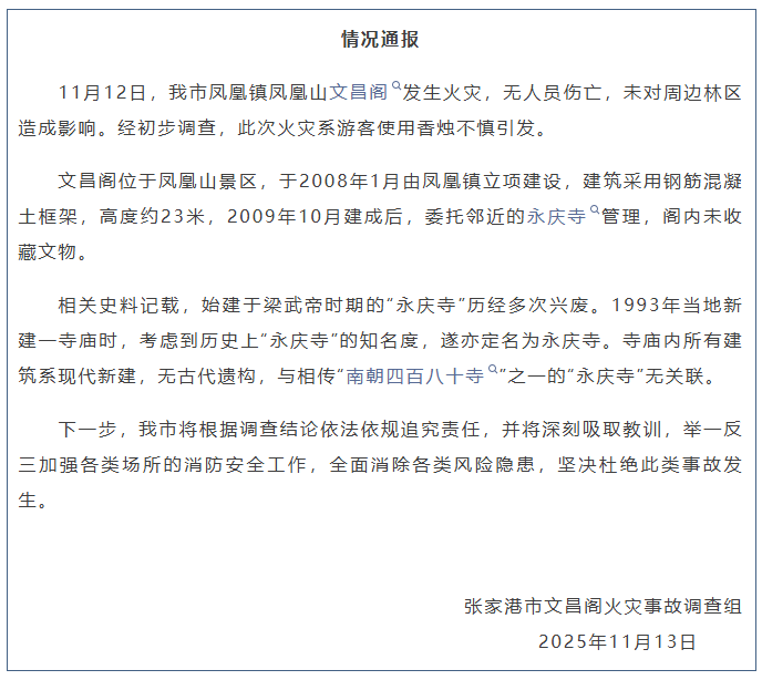 11月13日,张家港市文昌阁火灾事故调查组发布情况通报: