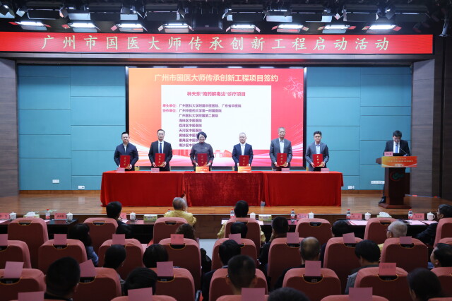 项目正式启动后,现场依次为国医大师邓铁涛“五脏相关”诊疗项目、国医大师禤国维特应性皮炎防治项目、国医大师周岱翰肝癌防治项目、国医大师林毅乳腺癌防治项目、国医大师林天东“南药解毒法”诊疗项目分别设立的5个市区联合管理中心授牌。广州中医药大学第一附属医院、省中医院和广州医科大学附属中医医院作为国医大师传承创新工程牵头单位,与全市包括省市区各级医疗机构的28家协作单位进行了签约。