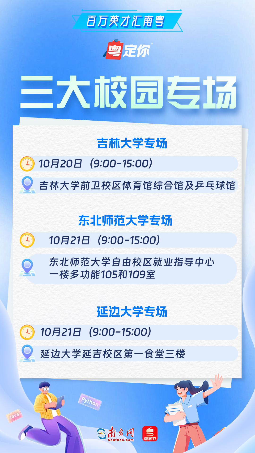 10月20日至21日,“百万英才汇南粤”2025年N城联动秋季招聘活动(吉林站)将在吉林大学、东北师范大学、延边大学举行。活动亮点如何?一组海报速览。