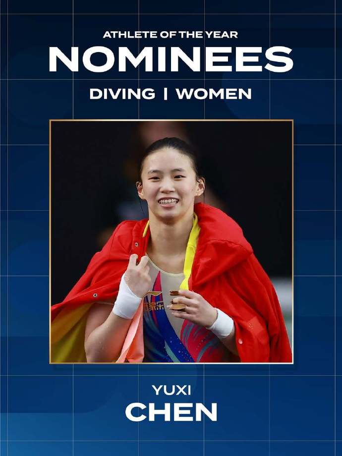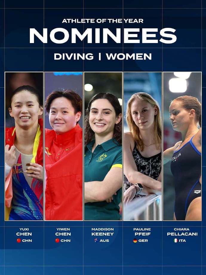 记者今天(14日)获悉,世界泳联公布年度最佳女子跳水运动员候选名单,中国选手陈芋汐、陈艺文入围。此外,候选名单中还有澳大利亚选手麦迪森·基尼、德国选手保利娜·普法伊夫、意大利选手基娅拉·佩拉卡尼。
