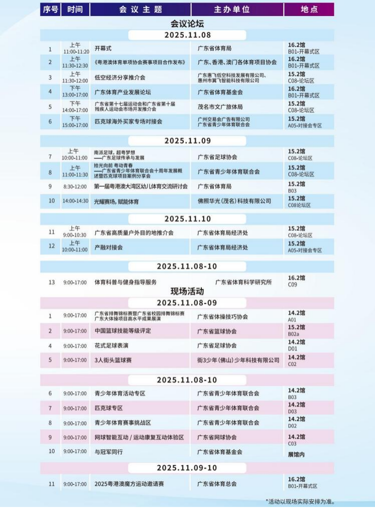 与此同时,展会同期还将举办“广东体育产业发展论坛”“粤港澳大湾区幼儿体育交流研讨会”“广东省第十七届运动会推介会”“广东省高质量户外目的地推介会”“产融对接会”“南派足球,超粤梦想”等多项会议、赛事相关活动。“以展带会”的举措,一方面丰富了展会内容,另一方面则致力于搭建产学研用一体化平台,为行业提供智库支持,驱动区域体育产业高质量发展。