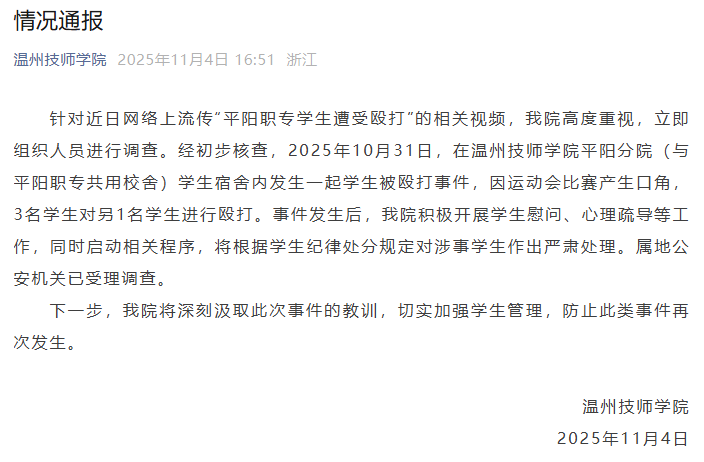 近日,网络上流传“平阳职专学生遭受殴打”的相关视频。温州技师学院11月4日就此事发布情况通报称,经初步核查,10月31日,在温州技师学院平阳分院(与平阳职专共用校舍)学生宿舍内发生一起学生被殴打事件,因运动会比赛产生口角,3名学生对另1名学生进行殴打。通报中还提到,温州技师学院将根据学生纪律处分规定对涉事学生作出严肃处理。属地公安机关已受理调查。