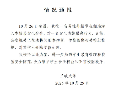 10月26日凌晨,我校一名男性外籍学生翻墙潜入本校某女生宿舍,对一名女生实施猥亵行为。目前,公安机关已依法将其刑事拘留,学校依据相关校纪校规,对其作出开除学籍处理。