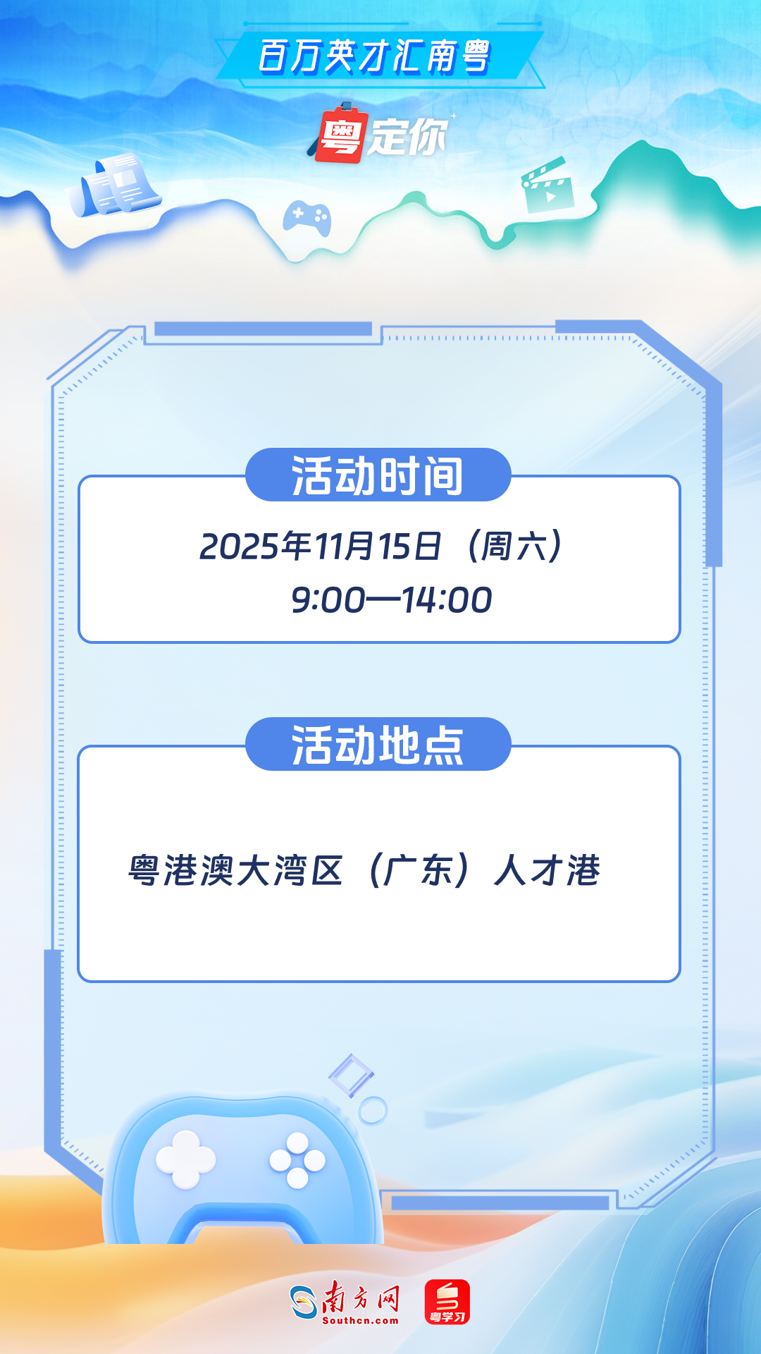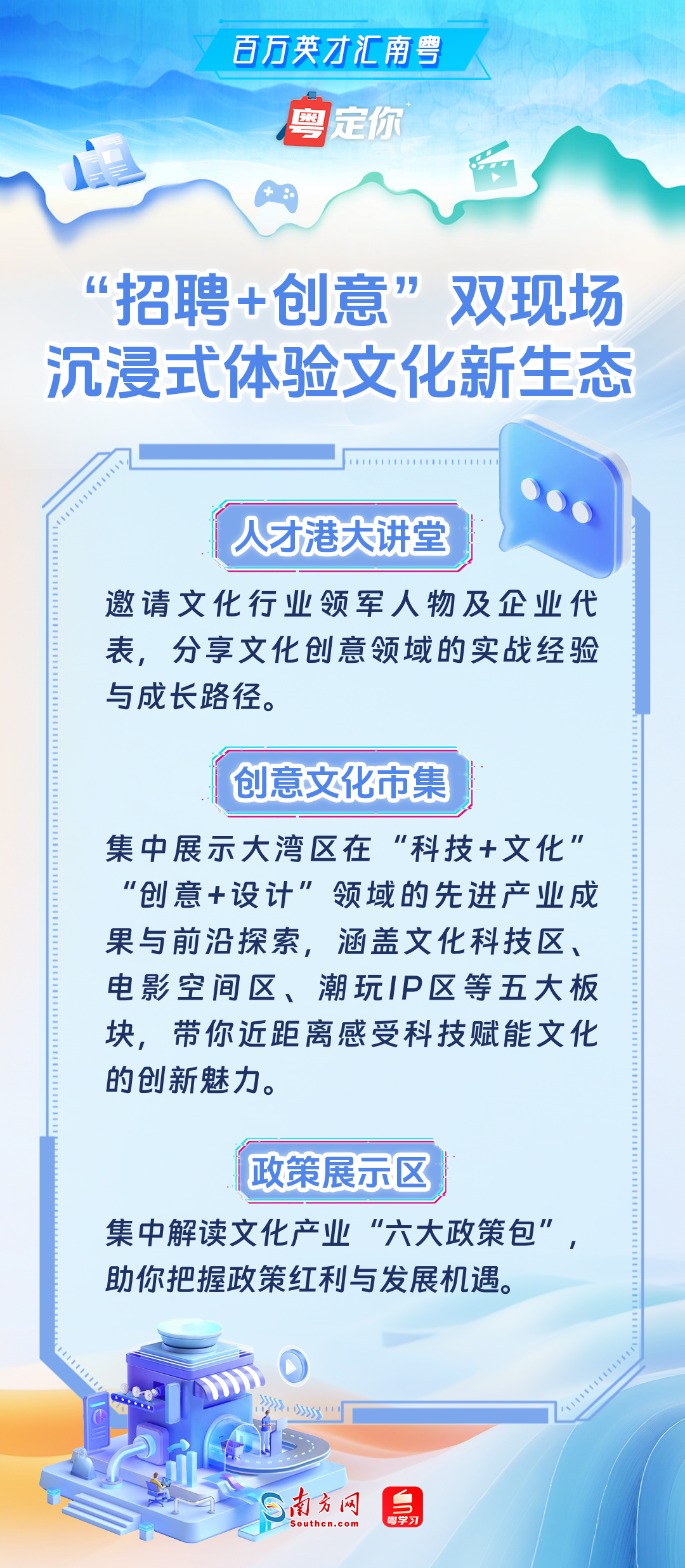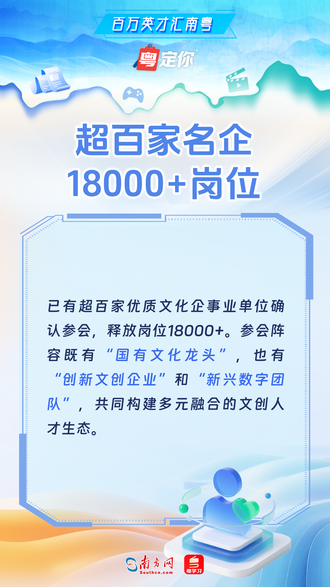 11月15日,由广东省委宣传部、广东省人力资源和社会保障厅联合主办的“百万英才汇南粤——文化产业人才荟”将开启,这不仅是一场汇聚超百家名企、释放18000+岗位的“求职盛宴”,更是一场融合科技、非遗、潮玩、影视、动漫的“可逛可玩可听可投”创意嘉年华。