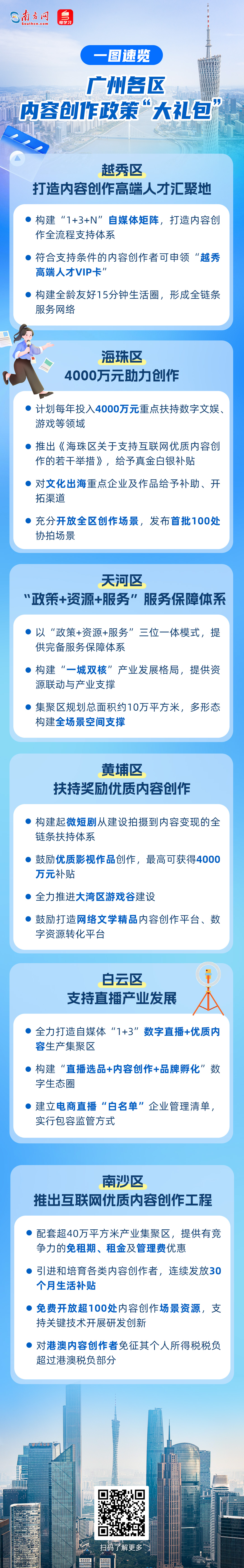 10月28日,2025内容创作者嘉年华在广州启动,集中发布了广东首个内容创作者发展扶持政策包。其中,广州越秀、海珠、天河、黄埔、白云、南沙等6区发布了一大批优质内容创作扶持政策,涉及资金扶持、培训孵化、平台曝光、人才引进等各个方面,福利多多、诚意满满!各位优质内容创作者,一张图带你读懂!