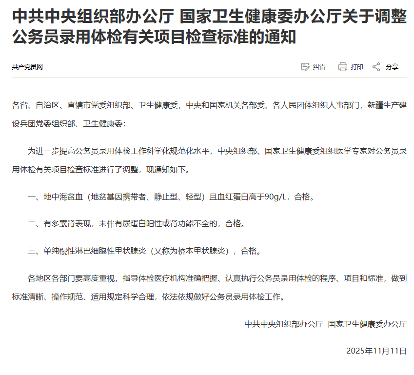 据共产党员网11月14日消息,近日,中共中央组织部办公厅 、国家卫生健康委办公厅发布通知称,为进一步提高公务员录用体检工作科学化规范化水平,中央组织部、国家卫生健康委组织医学专家对公务员录用体检有关项目检查标准进行了调整。调整内容如下: