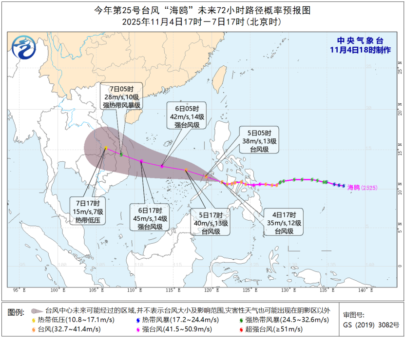 中央气象台11月4日18时继续发布台风蓝色预警。今年第25号台风“海鸥”的中心今天(4日)17时位于菲律宾苏禄海北部海面,就是北纬10.9度、东经121.3度,中心附近最大风力有12级(35米/秒),中心最低气压为970百帕,七级风圈半径200-280公里,十级风圈半径100至120公里,十二级风圈半径40公里。
