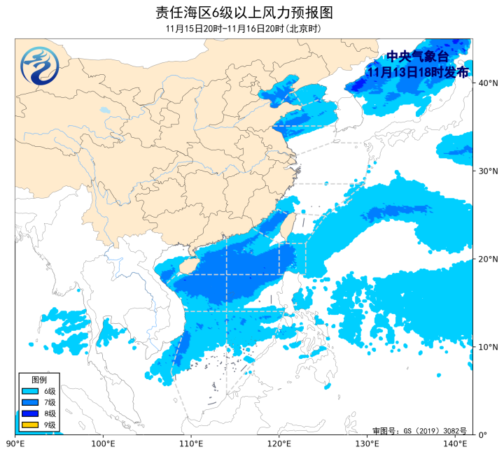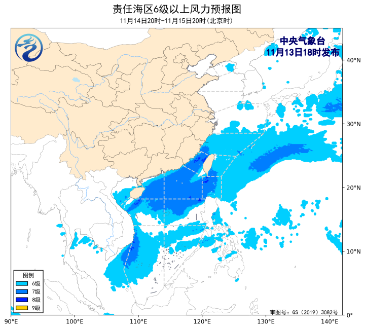 据中央气象台消息,11月13日02时至14时,东海大部海域、台湾海峡、台湾以东洋面出现了6~8级、阵风9~10级的大风,巴士海峡、南海西南部海域出现了5~6级、阵风7级的偏北风。