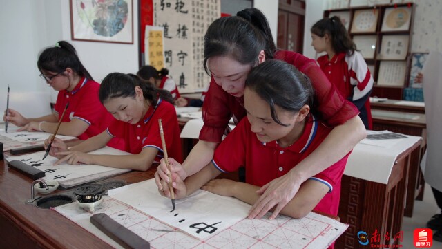 除了语文课和语言艺术社团,她还会在日常生活中有意识地和小区里遇到的孩子、菜市场的老板、大巴车司机,用普通话慢慢地清晰地沟通。同时,她还开设了书法社团,笔墨纸砚环绕的书法教室中,她一笔一画地传授写字技法。