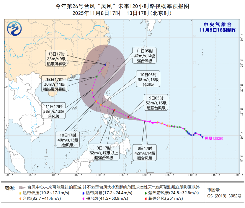 据中央气象台消息,今年第26号台风“凤凰”已于今天(8日)上午由台风级加强为强台风级,17时其中心位于北纬13.1度、东经129.6度,距离菲律宾马尼拉偏东方向约950公里,中心最大风力14级(42米/秒),中心最低气压为955百帕,七级风圈半径380公里至560公里。
