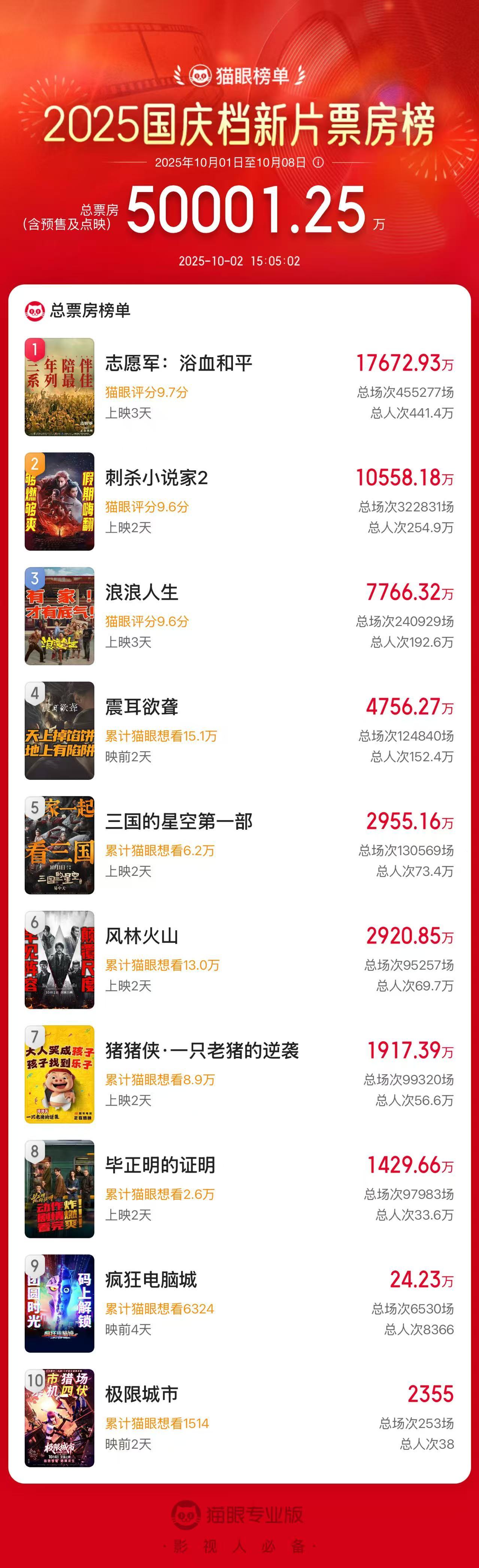 而正在上映中的国庆档,截至10月2日15时许,总票房已突破5亿元,《志愿军:浴血和平》《刺杀小说家2》《浪浪人生》分列票房榜前三位。